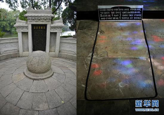 左图是中国江西抚州汤显祖之墓(新华社记者周密2016年10月12日摄);右图是英国埃文河畔斯特拉特福圣三一教堂的莎士比亚之墓(新华社记者韩岩2015年3月24日摄,拼版照片)。新华社发