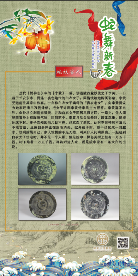 本展览将全国各地具有代表性的蛇文化主题的文物进行高清图片和说明文字展示,旨在弘扬中华优秀传统文化,营造蛇年新春浓厚氛围,让更多的观众了解中华蛇文化的起源与发展。