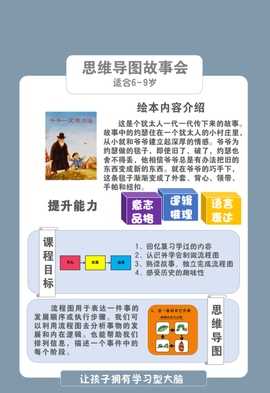 ![]() 阅趣玉茗堂招募令 思维导图故事会《爷爷一定有办法》 一、活动介绍 ![]() 故事的主人公是一个聪明能干的爷爷和他的孙子约瑟。当约瑟还是个娃娃的时候,爷爷为他缝制了一条奇妙的毯子,陪伴他度过了无数个温馨的夜晚。随着约瑟的长大,毯子变得老旧,但爷爷总有办法,将它变成一件外套、一件背心、一条领带,最后变成了一颗奇妙的纽扣。 ![]() 思维导图:思维导图能将原本杂乱无章的信息重新梳理,分门别类,变成有层级和结构的知识。最后整理出来的知识,就像一颗大树,从主干,到分枝,到小分枝,到材叶,一级一级地深入。思维导图可以让小朋友们的思维逻辑更加清晰,可以激发孩子们丰富的联想力,锻炼思维发散能力,提高孩子们的思考能力和学习能力。重整信息,促进记忆,让孩子们学会灵活地联想记忆,体现孩子在思考过程中的个性化特征,帮助孩子们全方面地描述和分析问题,找到解决问题的关键因素。本期思维导图故事会,我们将了解:流程图。 二、活动信息 1.活动时间 2024年10月26日(周六)上午10:00 2.活动地点: 玉茗堂三楼报告厅 3.参与对象: 6周岁以上少年儿童(限15组家庭) 4.报名方式:请扫描下方二维码报名 请扫码 ![]() 扫码参与 (温馨提示:①如有三次预约成功后迟到或缺席活动,将被列入我馆少儿活动黑名单;②如需取消预约,请提前24小时拨打电话0794-8220356告知。) 欢迎投稿:363036353@qq.com |