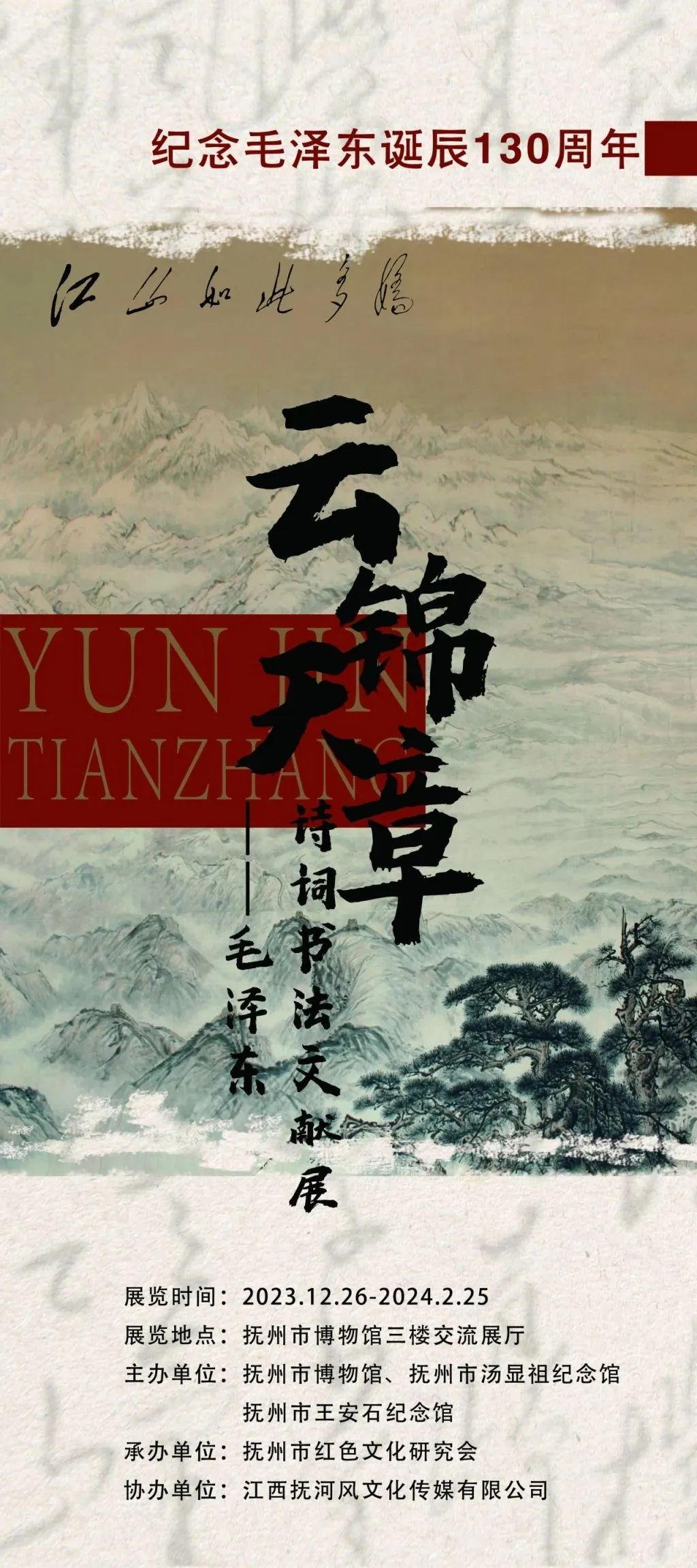 ![]() ![]() 2023年12月26日,“云锦天章——毛泽东诗词书法文献展”在抚州市博物馆三楼交流展厅展出。本次展览由抚州市博物馆、抚州市汤显祖纪念馆、抚州市王安石纪念馆主办,抚州市红色文化研究会承办。