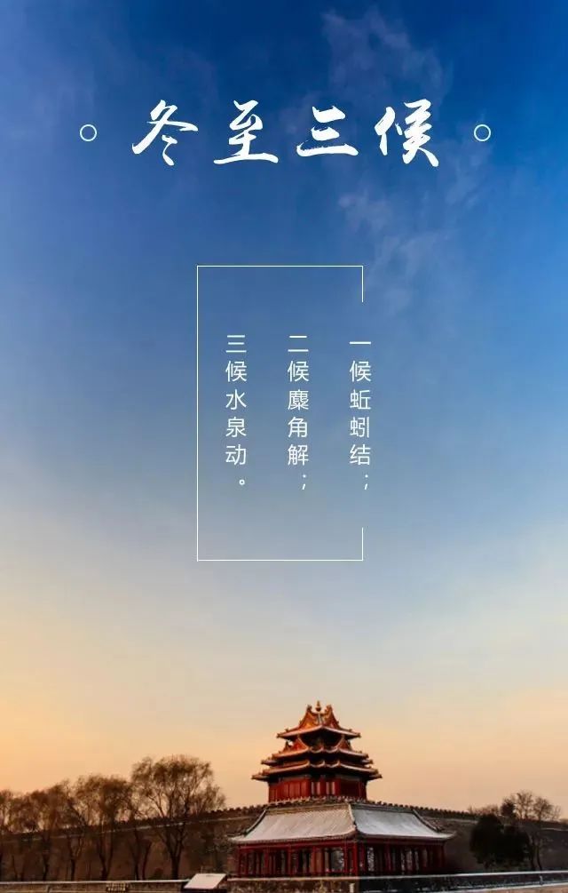 冬至三候 中国古人将冬至分为三候:“一候蚯蚓结;二候麋角解;三候水泉动。”
